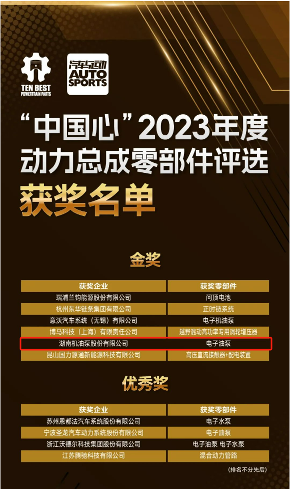 ?2023年11月8日 ,“中國心”2023年度動力總成零部件評選公布,湖南機(jī)油泵股份有限公司研發(fā)的電子油泵作為動力總成潤滑系統(tǒng)的“心臟”,榮獲了業(yè)界具影響力的金獎。這一殊榮不僅是對湖南機(jī)油泵不懈追求卓越品質(zhì)和技術(shù)領(lǐng)先地位的認(rèn)可,也標(biāo)志著公司在全球動力總成領(lǐng)域的領(lǐng)跑者地位。